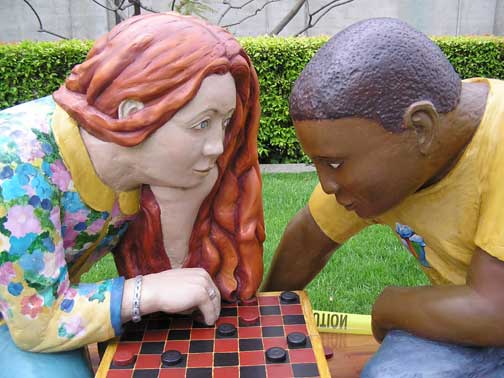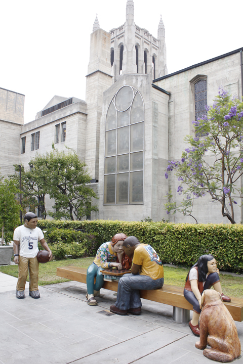 My wife and I commissioned an outdoor mahogany sculpture for Pilgrim School in Los Angeles, which was completed and installed in September 2002. The work consists of five larger-than-life figures of children and a dog which are vividly painted in elaborate detail. Since 2004 I have utilized Joey Wester’s services to repaint the figures as needed because of children scuffing them up while playing on them and deterioration from smog, heat/cold, wetness /dryness, and expansion/contraction of the wood caused by changes in the weather.